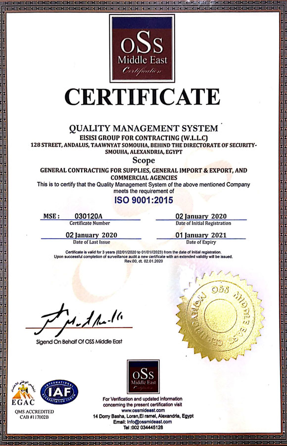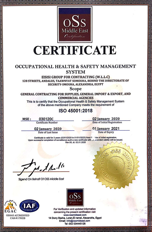حصلت الشركة على شهادات الجودة العالمية (ISO 14001 & ISO 9001 & ISO 45001) لضمان أعلى معايير السلامة المهنية والكفاءة التشغيلية